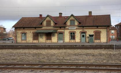 Keywords: billesholms train station sweden railway brick building rails tracks railroad