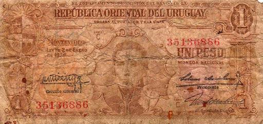 | Keywords: Billete de un peso uruguayo de fines de la década de 1930.jpg Billete de un peso uruguayo de fines de la década de 1930 2007-04-26 own assumed Santi92~commonswiki Banknotes of Uruguay José Gervasio Artigas on money Coats of arms of Uruguay on banknotes Banknotes with a face value of 1 |