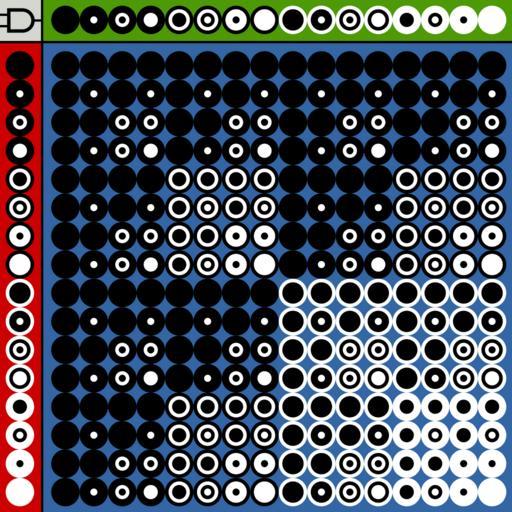 | Keywords: Binary Operations - AND operator.svg Binary ring diagram to illustrate operators on binary numbers The least significant bit LSB is the innermost ring Black signifies 0 white signifies 1 X is the number along the top Y is the number on the left Q is the result Bitwise AND operator <math>Q A \mbox AND B</math> own 2009-09-20 Inductiveload Own work all rights released Public domain Binary ring diagrams AND gates | ||||