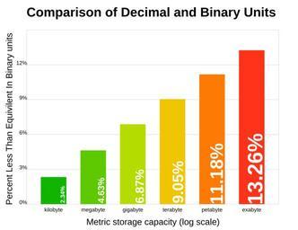 | Keywords: Binaryvdecimal.svg en This chart shows the growing percentage of the shortfall of decimal interpretations from binary interpretations of the unit prefixes plotted against the logarithm of storage size Example uses multiple units of bytes own Ryoushi19 <gallery> File Binaryvdecimal fr svg Français File Binary-decimal ka svg ქართულად File Binaryvdecimal mk svg акедонски File Binaryvdecimal-fi svg Suomi </gallery> ValidSVG Translation possible Technical diagrams Data management | ||||