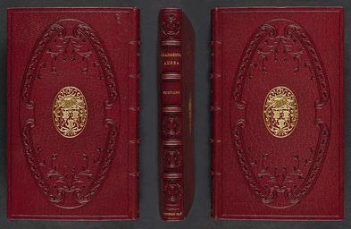 | Keywords: bindings text abstract indoor photo border texture writing pattern architecture door The upper and lower covers of this red goatskin binding are blind stamped with an oval floral design. One of Alexander H. Turnbull’s nine armorial crests is stamped in gold in the centre of both covers. The binder’s stamp on the 1st flyleaf reads “Bound by Zaehnsdorf 1914”; with Zaehnsdorf’s oval seal in gold on the lower pastedown. Purchased by Alexander H. Turnbull. John Suckling, Fragmenta aurea (London : prinred [sic] for Humphrey Moseley, and are to be sold at his shop at the signe of the Princes Arms in S. Pauls Church-yard, 1648). REng SUCK Frag 1648. The upper and lower covers of this red goatskin binding are blind stamped with an oval floral design. One of Alexander H. Turnbull’s nine armorial crests is stamped in gold in the centre of both covers. The binder’s stamp on the 1st flyleaf reads “Bound by Zaehnsdorf 1914”; with Zaehnsdorf’s oval seal in gold on the lower pastedown. Purchased by Alexander H. Turnbull. John Suckling, Fragmenta aurea (London : prinred [sic] for Humphrey Moseley, and are to be sold at his shop at the signe of the Princes Arms in S. Pauls Church-yard, 1648). REng SUCK Frag 1648. |