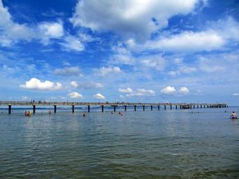 Keywords: binz germany sea ocean water sky clouds scenic pier walkway people swimming recreation nature outside summer