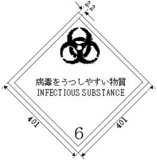 | Keywords: BiohazardSymbolTransportJapanDia6.jpg ja 日 で輸 する際に用いるバイオハザードマーク(国 の菱形標識) en UN Infectious Substances Dia symbol of Biohazard Symbol on Transporting in Japan 特定病原体等の運搬に係る容器等に関する基準 平成十 年六 日厚生労働 告示第二百 号 Stanadard packaging of specific pathogens Administrative Notice Japanese Ministry of Health Labour and Welfare Heisei-19 209 http //wwwhourei mhlw go jp/cgi-bin/t_document cgi MODE hourei DMODE CONTENTS SMODE NORMAL KEYWORD EFSNO 417 PAGE 0 FILE POS 0 HITSU 0 厚生労働 Japanese Ministry of Health Labour and Welfare 2007-06-01 PD-Japan-exempt symbol Biohazard symbols ADR 6 2-JP ADR images 6 2 |