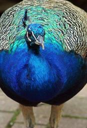 Keywords: bird peacock male close color feather iridescent plumage blue hahn