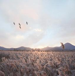 Keywords: bird sky nature blue white silhouette air fly flight flying summer black animal wildlife clouds flock wing sun landscape plain field grass wheat geese goose group scene scenery waterfowl brown plants sunny daylight outdoors