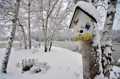 Keywords: birdhouse winter snow trees birch winter landscape ice