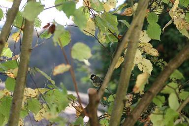 Keywords: birds bird little bird black and white tit blue tit fat balls bird seed food depend leaf leaves hidden true leaves green