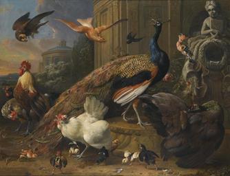 | Keywords: Birds disturbed by a falcon.jpg Artwork en A peacock and peahen together with a cockerel and other poultry a swallow pigeon and hoopoe beside a fountain in a garden all disturbed by the arrival of a falcon oil on canvas Size cm 137 1 168 2 Gustav Henrik Vilhelm Upmark Die Architektur der Renaissance in Schweden 1530-1760 1900 p 125 Inv A2325 Exhibited Berlin Staatliche Museen Melchior d'Hondecoeter 1636-1695 18 September 2010 - 2 January 2011 no 38 object history Anonymous sale London Sotheby's 8 December 1965 lot 76 for £2 600 to Spiller; With W H Patterson London December 1999; With Richard Green London; by 2013-12-04 acquisition Private collection Richard Green dealer London ProvenanceEvent 2013-12-04 sale unsold Private collection Sotheby's London 37 Melchior d'Hondecoeter exhibition history credit line accession number place of creation http //www sothebys com/fr/auctions/ecatalogue/2013/old-master-british-paintings-evening-l13036/lot 37 html PD-old-100 Uploaded with UploadWizard Paintings by Melchior d'Hondecoeter |