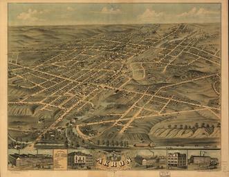 | Keywords: Bird's-eye View of the City of Akron, Summit County, Ohio, 1870 WDL9585.png Artwork ru Рюге Альбе т 1829-1899 гг fr Ruger Albert 1829-1899 en Ruger Albert 1829-1899 zh 阿尔伯特·鲁格,1829-1899 年 pt Ruger Albert 1829-1899 ar ألبرت روجر ، 1829-1899 es Ruger Albert 1829-1899 ru Вид с высоты птичьего полета на го од Ак он ок уг Саммит штат Огайо 1870 г fr Vue aérienne de la ville d'Akron dans le comté de Summit dans l'Ohio 1870 en Bird's-eye View of the City of Akron Summit County Ohio 1870 zh 俄亥俄州萨米特县阿克伦市鸟瞰图,1870 年 pt Vista panorâmica da cidade de Akron condado de Summit Ohio 1870 ar لقطة من أعلى لمدينة أكرون، مقاطعة سامت، أوهايو، 1870 ru а этой пано амной ка те показан г Ак он штат Огайо в том виде какой он имел в 1870 г В пе ечне обозначений в нижней части ка ты указаны п едставляющие инте ес места в том числе здание суда с едняя школа ок ужная тю ьма железная до ога и многочисленные це кви а иллюст ациях изоб ажены важные здания в том числе музыкальная академия х ам масонов завод по п оизводству ножей и две к упных фаб ики по п оизводству косилок и жаток Пано амная ка та являлась ка тог афической фо мой кото ую ши око использовали для изоб ажения аме иканских и канадских к упных и мелких го одов в конце XIX и в начале XX века Также называемые видами с высоты птичьего полета или пе спективными ка тами они п едставляют изоб ажения го одов как будто п и осмот е све ху под ост ым углом Обычно не выче чиваемые в масштабе они показывают асположение улиц отдельные здания и главные особенности пейзажа в пе спективе Эта ка та выполнена Альбе том Рюге ом 1829 1899 гг пе вым аме иканцем достигшим успеха как пано амный художник Родившийся в П уссии Рюге пе еселился в Соединенные Штаты Аме ики и сначала аботал каменщиком П оходя службу в ядах доб овольцев Огайо во в емя Г ажданской войны он исовал виды палаточных лаге ей а мии Союза После войны Рюге поселился в Батл-К ике штат ичиган где начал свою деятельность по составлению пано амных ка т исуя эскизы го одов штата ичиган В конце 1860-х гг Рюге создал това ищество с Дж Дж Стоуне ом из эдисона штат Висконсин и вместе они опубликовали множество го одских пано ам <br>Аэ офотоснимки; Го ода и поселки; Пано амные виды fr Cette carte panoramique d'Akron dans l'Ohio montre la ville telle qu'elle était en 1870 La légende du bas indique les points d'intérêt notamment le palais de justice le lycée la prison du comté le chemin de fer et de nombreuses églises Les illustrations représentent les édifices importants comme l'académie de musique le temple maçonnique la coutellerie et deux vastes usines de faucheuses et moissonneuses La carte panoramique était un type de carte communément utilisé pour représenter des villes américaines et canadiennes vers la fin du XIX<sup>e</sup> et le début du XX<sup>e</sup> siècle Également connues sous le nom de vues aériennes ou cartes de vue en perspective elles représentent les villes vues d'en haut et en oblique Pas toujours dessinées à l'échelle les cartes révèlent le tracé des rues les bâtiments individuels ainsi que les caractéristiques essentielles du paysage en perspective Cette carte est l œuvre d'Albert Ruger 1829-1899 le premier artiste panoramique américain à connaître le succès Né en Prusse Ruger immigra aux États-Unis et commença à travailler en tant que maçon Alors qu'il servait au sein des Volontaires de l'Ohio pendant la guerre de Sécession il dessina des panoramas des camps de l'Union Après la guerre Ruger s'installa à Battle Creek dans le Michigan où il entama sa carrière de dessinateur de cartes panoramiques en faisant des esquisses des villes du Michigan Vers la fin des années 1860 Ruger s'associa avec J J Stoner de Madison dans le Wisconsin et publia avec lui de nombreux panoramas urbains <br>Vues aériennes; Petites et grandes villes; Vues panoramiques en This panoramic map shows Akron Ohio as it appeared in 1870 The key at the bottom indicates points of interest including the courthouse high school county jail railroad and numerous churches Illustrations depict important buildings including the academy of music Masonic temple knife works and two large factories for making mowers and reapers The panoramic map was a cartographic form popularly used to depict U S and Canadian cities and towns in the late 19th and early 20th centuries Also known as bird's-eye views or perspective maps they are representations of cities portrayed as if viewed from above at an oblique angle Not generally drawn to scale they show street patterns individual buildings and major landscape features in perspective This 