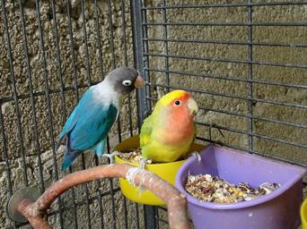 Keywords: birds pair pets beautiful parrots colorful cage