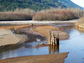 Keywords: birkenhead river marshland wetland water sand banks wooden poles springtime nature landscape pemberton british columbia canada