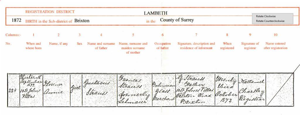 | Keywords: Birth certificate of Florence Annie Strauss.PNG en Birth certificate of Florence Annie Strauss 10 St John's Villas Brixton Lambeth London 1872-09-13 i Ancestry com and ii the General Register Office Southport Merseyside England n/a other versions Custom license marker 2015 11 29 DrSchaub Uploaded with UploadWizard Uncategorized 2015 November 29 |