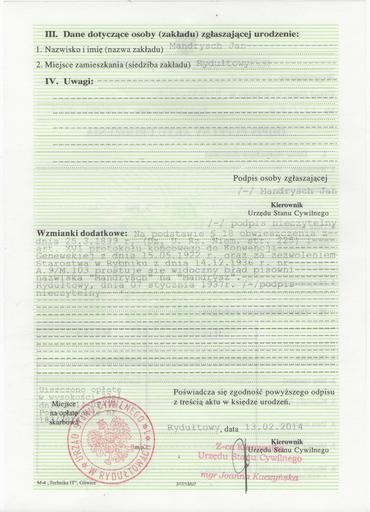 | Keywords: Birth certificate with changed name.jpg en Second page of birth certificate with lawlessly changed name by polish governament in 1937 year pl Druga strona odpisu zupełnego aktu urodzenia ze spolszczonym przez polski aparat państwowy nazwiskiem w 1937 roku delivered by polish civil registry scane made by me 2014-02-15 PD-Polishsymbol Documents Cc-zero |