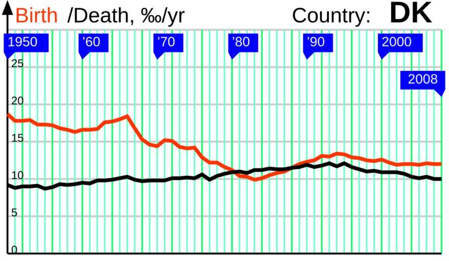 | Keywords: BirthDeath 1950 DK.svg en The birth and death rates in Denmark 1950 2008 ru Π ΠΎΠΆΠ΄Π°Π΅ΠΌΠΎΡΡΡ ΠΈ ΡΠΌΠ΅Ρ ΡΠ½ΠΎΡΡΡ Π² ΠΠ°Π½ΠΈΠΈ 1950 2008 own Incnis Mrsi 2009-07-13 public domain File RNI 1950 DK svg Disclaimer The author of this graph gives no warranty and accepts no responsibility for its factual accuracy This graph is nothing but a visualization of data from http //demoscope ru/weekly/ias/ias05 php tim 0 cou 11 terr 1 ind 26 Submit OK http //demoscope ru/weekly/ias/ias05 php tim 0 cou 11 terr 1 ind 1 Submit OK which may be incomplete or error-prone If you find an error please correct the data in a <path d ¦ /> tag adding some comments about your reliable source and upload the file over Demographics of Denmark Birth and death rates |