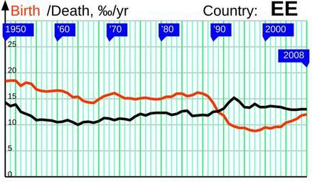 | Keywords: BirthDeath 1950 EE.svg en Estonia's birth and death rates 1950 2008 ru Π ΠΎΠΆΠ΄Π°Π΅ΠΌΠΎΡΡΡ ΠΈ ΡΠΌΠ΅Ρ ΡΠ½ΠΎΡΡΡ Π² ΠΡΡΠΎΠ½ΠΈΠΈ 1950 2008 own Incnis Mrsi 2009-07-13 public domain File RNI 1950 EE svg Disclaimer The author of this graph gives no warranty and accepts no responsibility for its factual accuracy This graph is nothing but a visualization of data from http //demoscope ru/weekly/ias/ias05 php tim 0 cou 39 terr 1 ind 26 Submit OK http //demoscope ru/weekly/ias/ias05 php tim 0 cou 39 terr 1 ind 1 Submit OK which may be incomplete or error-prone If you find an error please correct the data in a <path d ¦ /> tag adding some comments about your reliable source and upload the file over Temporal population graphs of Estonia Birth and death rates |