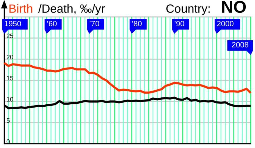 | Keywords: BirthDeath 1950 NO.svg en The birth and death rates in Norway 1950 2008 ru Π ΠΎΠΆΠ΄Π°Π΅ΠΌΠΎΡΡΡ ΠΈ ΡΠΌΠ΅Ρ ΡΠ½ΠΎΡΡΡ Π² Π ΠΎΡ Π²Π΅Π³ΠΈΠΈ 1950 2008 own Incnis Mrsi 2009-07-13 public domain File RNI 1950 NO svg Disclaimer The author of this graph gives no warranty and accepts no responsibility for its factual accuracy This graph is nothing but a visualization of data from http //demoscope ru/weekly/ias/ias05 php tim 0 cou 23 terr 1 ind 26 Submit OK http //demoscope ru/weekly/ias/ias05 php tim 0 cou 23 terr 1 ind 1 Submit OK which may be incomplete or error-prone If you find an error please correct the data in a <path d ¦ /> tag adding some comments about your reliable source and upload the file over Demographics of Norway Birth and death rates |