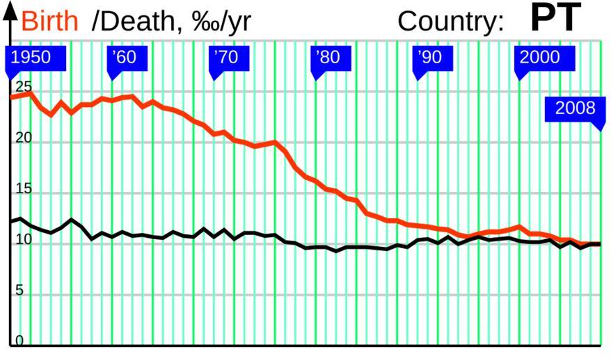 | Keywords: BirthDeath 1950 PT.svg en The birth and death rates in Portugal 1950 2008 ru Рождаемость и сме тность во По угалии 1950 2008 own Incnis Mrsi 2009-07-14 public domain File RNI 1950 PT svg Disclaimer The author of this graph gives no warranty and accepts no responsibility for its factual accuracy This graph is nothing but a visualization of data from http //demoscope ru/weekly/ias/ias05 php tim 0 cou 25 terr 1 ind 26 Submit OK http //demoscope ru/weekly/ias/ias05 php tim 0 cou 25 terr 1 ind 1 Submit OK which may be incomplete or error-prone If you find an error please correct the data in a <path d /> tag adding some comments about your reliable source and upload the file over Demographics of Portugal Birth and death rates |