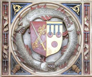 Keywords: BishopBishopPeterCourtenay ChimneypieceExeterPalace SeeImpalingCourtenay.JPG of the Courtenay Mantelpiece compiled by Maria Halliday privately published at the Office of the Torquay Directory 1884 Detail from Bishop Courtenay's Mantelpiece Bishop's Palace Exeter own photo 2013 Lobsterthermidor <span class signature-talk >talk</span> 11 47 8 October 2013 UTC Also uploaded to Flickr by author under another pseudonym http //www flickr com/photos/99926032 N03/ Bishop Courtenay's Mantelpiece Exeter Palace Coats of arms of See of Winchester Courtenay arms Taken with Ricoh R10 Courtenay dolphin Peverell garb Hungerford sickles Tau cross and bell of St Anthony