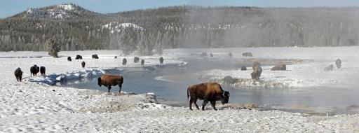 Keywords: bison buffalo herd hot springs winter yellowstone national park wildlife nature steam landscape panorama scenic grazing cold wyoming usa