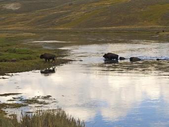 Keywords: bison herd wandering water yellowstone national park wyoming usa landscape nature animals