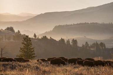 Keywords: bison herd wildlife buffalo nature valley hills wild fog mist landscape horizon outdoors grazing