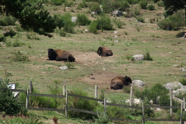 Keywords: bison wild bison reserve animals rest margeride europe france pasture bison europe bordeaux lozère landscape nature relaxation nap trees bushes summer animal grass feed pre fauna flora wooden fence field mammal