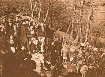 Keywords: Bitusha-1908-nevesta.jpg Завеждане на булката на чешмата в село Битуша 1908 http //www reka org mk/default asp lang mac Georgi Traychev Гео ги Т айчев 1880-1935 1908 Bituše PD-old