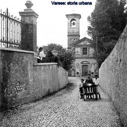 Keywords: Immagine di via Castiglioni ancora acciottolata, sullo sfondo la chiesa di Sant'Anna. varese biumosuperiore