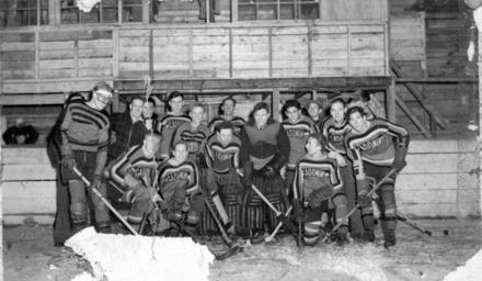 | Keywords: hockey alberta ice hockey icehockey blackandwhite monochrome outdoor black and white Cadomin, Alberta. Back row (left to right): Henry Gralon (behind hockey player), Alex Matheson, Frank Popowich, Henry Kwisney, Jack Chambers, Louie Joy, Frankie Brown, Dixon MacKinnon, Ted Dombroski, Raymond Reston. Front row (left to right): Sydney MacLeod, Jack Chesney, Ryse Morgan, Bill (Windy) Shearer, Steve (Bingo) Merluck, Ray Reston. 1938, A15157. Cadomin, Alberta. Back row (left to right): Henry Gralon (behind hockey player), Alex Matheson, Frank Popowich, Henry Kwisney, Jack Chambers, Louie Joy, Frankie Brown, Dixon MacKinnon, Ted Dombroski, Raymond Reston. Front row (left to right): Sydney MacLeod, Jack Chesney, Ryse Morgan, Bill (Windy) Shearer, Steve (Bingo) Merluck, Ray Reston. 1938, A15157. |