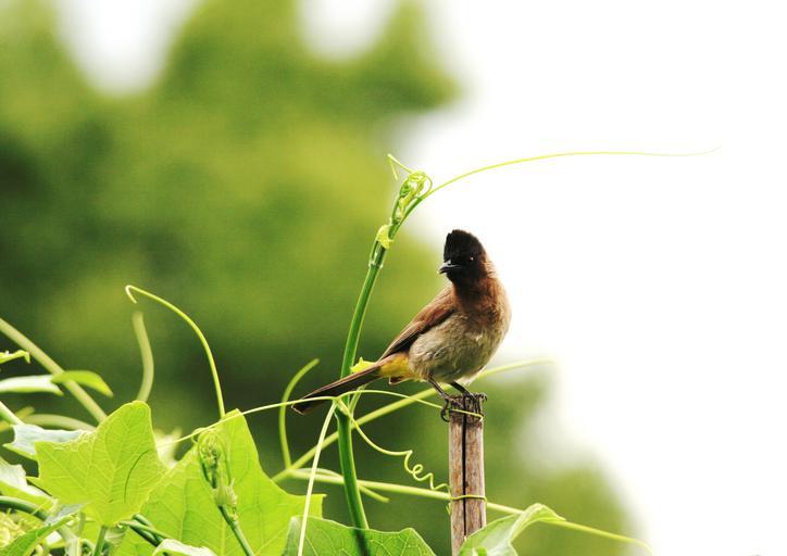 Keywords: black eyed bul-bul bird black and brown head turned grapevine