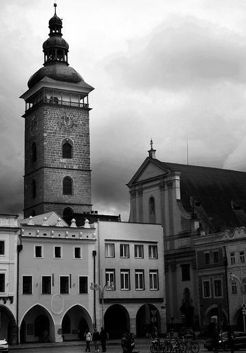 Keywords: black tower road black and white bohemia square weekday paving street old building south bohemia českě české budějovice city center characters city