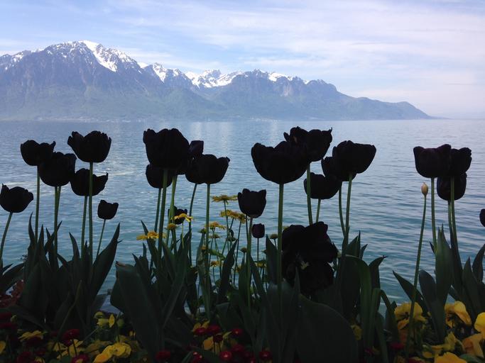 Keywords: black tulips silhouettes lake alps montreux