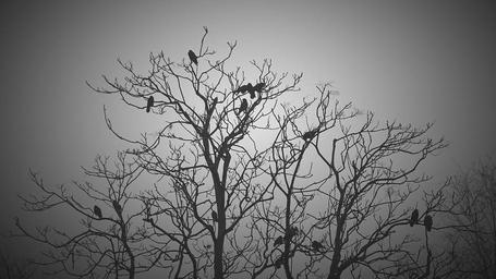 Keywords: black white tree birds animals dark gloomy autumn winter evening loneliness oppressive
