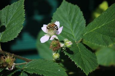 Keywords: blackberry blossom bloom bee immature green plant white blossom leaf