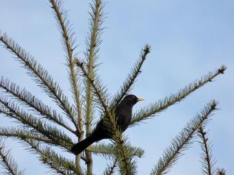 Keywords: blackbird bird treetop nature den fir green conifer black yellow beak