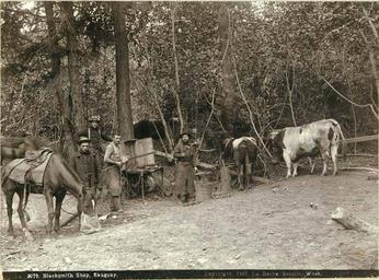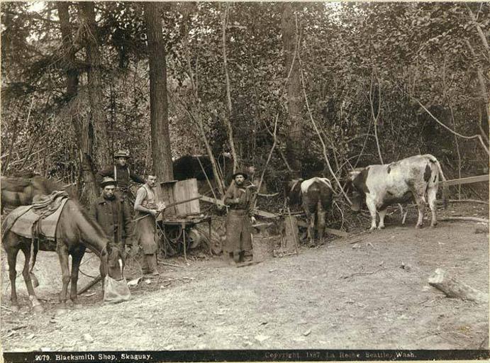 | Keywords: Blacksmith shop at Skagway, White Pass Trail, Alaska, 1897 (LAROCHE 197).jpeg check categories 9 June 2016 3 Photograph Creator Frank La Roche Caption on image Blacksmith Shop Skaguay c1897 Blacksmith shop at Skagway Here the blacksmith charges 6 for shoeing a horse and 10 for shoeing oxen; in the latter part of August 1897 During the horseshoe nail famine as much as 1 was paid for a nail Several in-going parties to the Klondike have taken burros and small horses instead of dogs for draft general-service beasts It is said that one pony or burro will draw 3 000 pounds on the frozen surface of a lake Another advantage claimed is that they can be used more profitably as pack animals during the summer But one of the possible advantages not to be overlooked is the fact that healthy horseflesh is a luxery when no other food is in sight Frank La Roche En Route to the Klondike 1898 Klondike Gold Rush Subjects LCTGM Blacksmiths--Alaska--Skagway; Forge shops--Alaska--Skagway Subjects LCSH White Pass Trail Alaska ; Trails--Alaska depicted place Skagway Alaska 1897 Institution University of Washington UWASH-LAROCHE-source accession number laroche 197 PD-old-auto-1923 1936 Information field Order Number LAR220 Images from the Frank La Roche Photographs Collection to check Blacksmiths Trails Skagway Alaska |