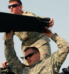 | Keywords: Blades Off DVIDS78898.jpg en Pfc Brian Smith from Laceyville Pa and Spc Ray O'Neil from York Pa help lower the blade of an AH-64 Apache Longbow helicopter to the ground March 1 Each blade weights approximately 150 pounds Smith and O'Neil are members of Troop N 4th Squadron 3rd Armored Cavalry Regiment which is assigned to Multi-National Division - Baghdad's Task Force XII U S Army photo/Sgt Brandon Little 2008-03-01 https //www dvidshub net/image/78898 78898 2008-03-01 14 34 TAJI IQ PD-USGov AH-64 Apache Images from DoD uploaded by Fæ 4th Squadron 3rd Cavalry Regiment |