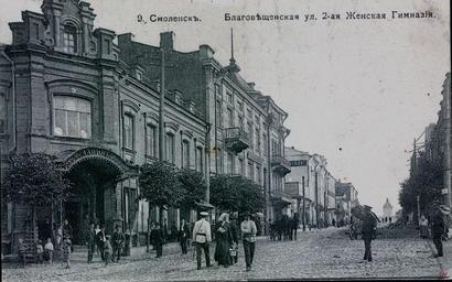 | Keywords: Blagoveshchenskaya street, Smolensk 2.jpg en Blagoveshchenskaya Street now Big Soviet Street 2nd women's gymnasium ru Благовещенская улица ныне - Большая Советская улица 2-я женская гимназия О игинальная отк ытка е установлены before 1917 года PD-RusEmpire 20th-century postcards of Russia Postcards of Smolensk |