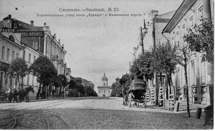 | Keywords: Blagoveshchenskaya street, Smolensk 4.jpg en Blagoveshchenskaya Street now Big Soviet Street in Smolensk and left - the building of the hotel France in front - Molohovskie gate ru Благовещенская улица ныне - Большая Советская улица в Смоленске слева - здание гостиницы Ф анция впе еди - олоховские во ота О игинальная отк ытка е установлены before 1917 года PD-RusEmpire 20th-century postcards of Russia Postcards of Smolensk | ||||