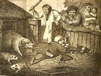 MAKE A MEME View Large Image Blake for The Wit's Magazine - 1784.jpg and comment from M Dorothy George 'Catalogue of Political and Personal Satires in the British Museum' VI 1938 The parson dissatisfied at the young pig offered by 'Hodge' has entered the sty in order ...