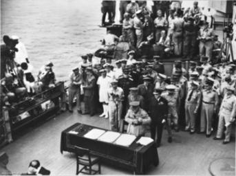 | Keywords: BLAMEY surrender 1945.jpg en AWM caption Tokyo Bay Japan 2 September 1945 General Sir Thomas Blamey at the table about to sign the surrender document on behalf of Australia Behind General Blamey are the other members of the Australian delegation The signing took place on board Admiral Nimitz's flagship USS Missouri Allied delegations are lined up behind their delegation leader waiting their turn to sign the surrender document Left to right Admiral Chester W Nimitz US; General Hsu Yung-Chang Nationalist Chinese; Admiral Sir Bruce Fraser UK; Lt Gen K N Derevyanko Soviet Union; Colonel L Moore-Cosgrove Canada; Gen B J Le Clerc France; Admiral Conrad Helfrich Netherlands; Air Vice Marshal Isitt New Zealand In the foreground is the Japanese General Yoshijiro Umezo and Mr Mamoru Shigemitsu hand to head the signatories for Japan 019131 unknown photographer -- now belonging to Commonwealth of Australia 1945-09-02 The AWM record for this photo states that the copyright status is 'clear' The photo was taken prior to 1955 PD-Australia The AWM allows the use of images from its online database whose copyright has expired for non-commercial purposes only on the condition that the AWM's watermark is not removed The Australian War Memorial AVM however requires that the AWM watermark is not removed and that permission be sought for commercial use Higher resolution versions of this image may be ordered through the AWM Website at http //www awm gov au Surrender of Japan 2 September 1945 Thomas Blamey Military history of Australia during World War II Japanese Surrender Black and white photographs |