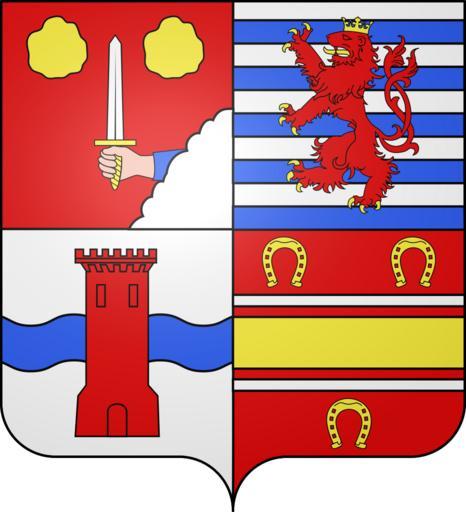 | Keywords: Blason de la ville de Hagondange (Moselle).svg blazon of en city of Hagondange Hagondange Moselle Hagondange fr Écartelé au premier de gueules au dextrochère de carnation paré d'azur mouvant d'une nuée d'argent tenant une épée du même garnie d'or et accostée en chef de deux cailloux du même au deuxième burelé d'argent et d'azur au lion à la queue fourchue de gueules armé lampassé et couronné d'or brochant sur le tout au troisième d'argent à la fasce ondée d'azur à la tour de gueules maçonnée de sable brochant sur le tout au quatrième de gueules à la fasce d'or côtoyée de deux divises d'argent accompagnée de trois fers à cheval aussi d'or spax89 Projet Blasons Own spax89 v -Blasons other versions Hagondange Coats of arms of cities in Moselle SVG coats of arms of France Armes du chapitre de la Cathédrale de Metz Double-tailed lion of Luxemburg in heraldry Horseshoes in heraldry DEFAULTSORT Hagondange |
