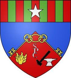 | Keywords: Blason de la ville de Saint-Pierre-des-Corps (37).svg blazon of en city of Saint-Pierre-des-Corps Saint-Pierre-des-Corps Indre-et-Loire Saint-Pierre-des-Corps Indre-et-Loire fr De gueules au brasier d'or à dextre au marteau versé de sable posé en barre contre une enclume d'argent à senestre le tout surmonté des lettres S P et C capitales du même entrelacées en pal au mantel d'azur aux deux clefs d'or posées en chevron brochant sur le mantelé leurs pannetons en pointe et liées par un anneau du même au chef cousu de gueules chargé de quatre pals cousus de sinople et d'une étoile d'argent brochant en cœur spax89 Projet Blasons Own spax89 v -Blasons other versions Saint-Pierre-des-Corps Anvils in heraldry Hammers in heraldry 2 keys Or in heraldry Canting arms Coats of arms of cities in Indre-et-Loire SVG coats of arms of France DEFAULTSORT Saint-Pierre-des-Corps |