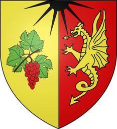 Keywords: Blason ville fr Sigoulès (Dordogne).svg fr parti au 1er d'or à une grappe de raisin de gueules pamprée au naturel au 2nd de gueules à un dragon volant d'or mis en pal au soleil de six rais de sable mouvant du chef et brochant sur la partition own Jacques63 2010-08-24 DEFAULTSORT Sigoules Coats of arms of cities in Dordogne Sigoulès Blason Wyverns in heraldry Sun in heraldry