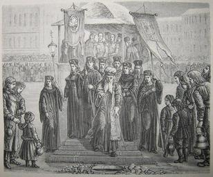 | Keywords: BlesssingofWatersNeva.jpg The Great Blessing of Waters on the Neva River during Epiphany Das heutige Rußland Bilder und Schilderungen aus allen Theilen des Europäischen Zarenreichs Lankenau und Ölsnitz Leipzig 1876 1876 Uncertain Водосвятие на еве в день К ещения Господня Рисунок из немецкой книги « ынешняя Россия Рисунки и изоб ажения из всех частей ев опейского ца ства» Лейпциг 1876 PD-Art Neva River Holy water Blessings Orthodox monks Art of the Russian Orthodox Church Epiphany Great Blessing of Waters at Theophany Published in Leipzig |
