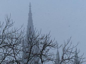 Keywords: blizzard snow flurry snowflakes snowfall snow storms winter cold snow flake forward wind icy steeple spire münster ulm cathedral