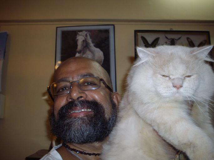 Keywords: BloggerBackpacker Rudolph.A.Furtado with Tomcat Matata.(Thursday 18-10-2012).JPG en A self photograph of myself with 3 1/2 year old tomcat Matata own Rudolph A furtado Thursday 18-10-2012 Men with cats Cc-zero