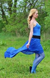 Keywords: blonde woman fairy field beauty blue skirt wind outdoors
