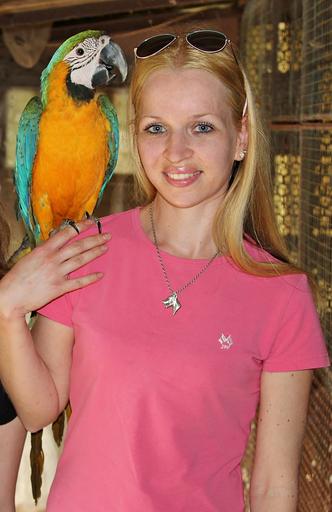 Keywords: blonde woman parrot macaw love