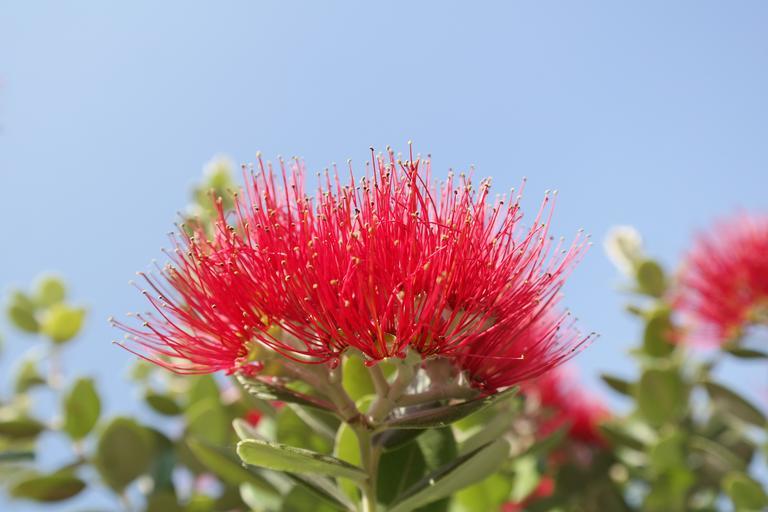 Keywords: blossom bloom red flowers ironwood tree christmas metrosideros excelsa metrosideros tomentosa myrtle plant myrtaceae new zealand christmas tree pohutukawa street tree green tree ornamental brush ironwood metrosideros